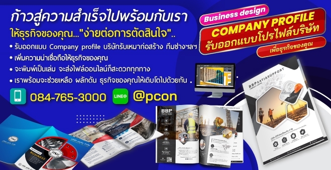 บริการรับทำ Company Profile โปรไฟล์บริษัท โทร. 084-765-3000 ไลน์ไอดี. @pcon ด้วยทีมงานมืออาชีพ ตั้งแต่เริ่มต้น จนถึงการนำไปใช้งานให้เกิดประโยชน์สูงสุด เรามีทีมงานมืออาชีพด้านการจัดทำโปรไฟล์บริษัทโดยเฉพาะที่จะช่วยออกแบบกราฟิกและด้านเนื้อหาให้มีความสวยงาม มีความน่าสนใจต่อผู้ที่ได้เปิดอ่านโปรไฟล์เล่มนี้ รวมไปถึงเนื้อหาของโปรไฟล์ที่นำเสนอจุดเด่นของบริษัท ข้อมูลของธุรกิจที่ครบถ้วน ทีมงานของเราช่วยให้ธุรกิจของท่านก้าวนำหน้าคู่แข็งอยู่เสมอ
